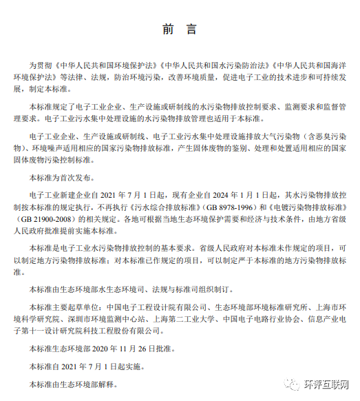 《電子工業(yè)水污染物排放標準》自2021年7月1日起實施。