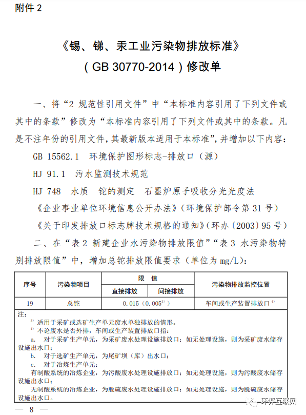 2.《錫、銻、汞工業(yè)污染物排放標準》(GB 30770-2014)修改單
