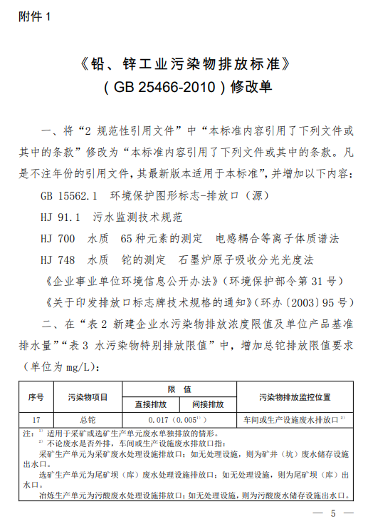 附件:1.《鉛、鋅工業(yè)污染物排放標準》(GB 25466-2010)修改單