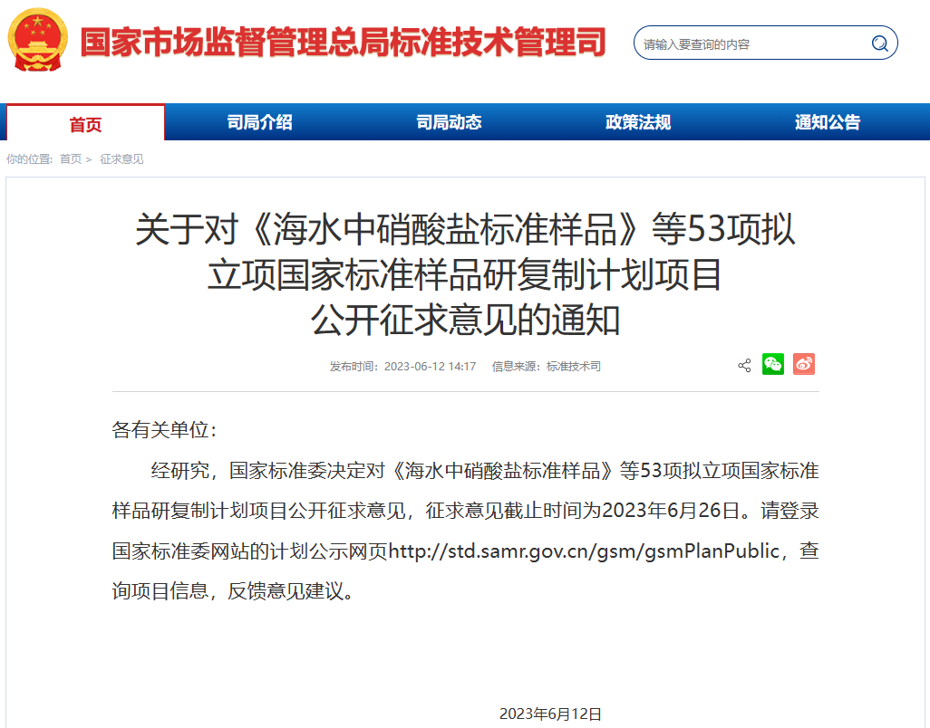近日,國家市場監(jiān)督管理總局標(biāo)準(zhǔn)技術(shù)管理司發(fā)布《關(guān)于對<海水中硝酸鹽標(biāo)準(zhǔn)樣品>等53項(xiàng)擬立項(xiàng)國家標(biāo)準(zhǔn)樣品研復(fù)制計(jì)劃項(xiàng)目公開征求意見的通知》,通知提到,經(jīng)研究,國家標(biāo)準(zhǔn)委決定對《海水中硝酸鹽標(biāo)準(zhǔn)樣品》等53項(xiàng)擬立項(xiàng)國家標(biāo)準(zhǔn)樣品研復(fù)制計(jì)劃項(xiàng)目公開征求意見,相關(guān)項(xiàng)目信息可登錄國家標(biāo)準(zhǔn)委網(wǎng)站的計(jì)劃公示網(wǎng)頁查詢,并反饋意見建議。