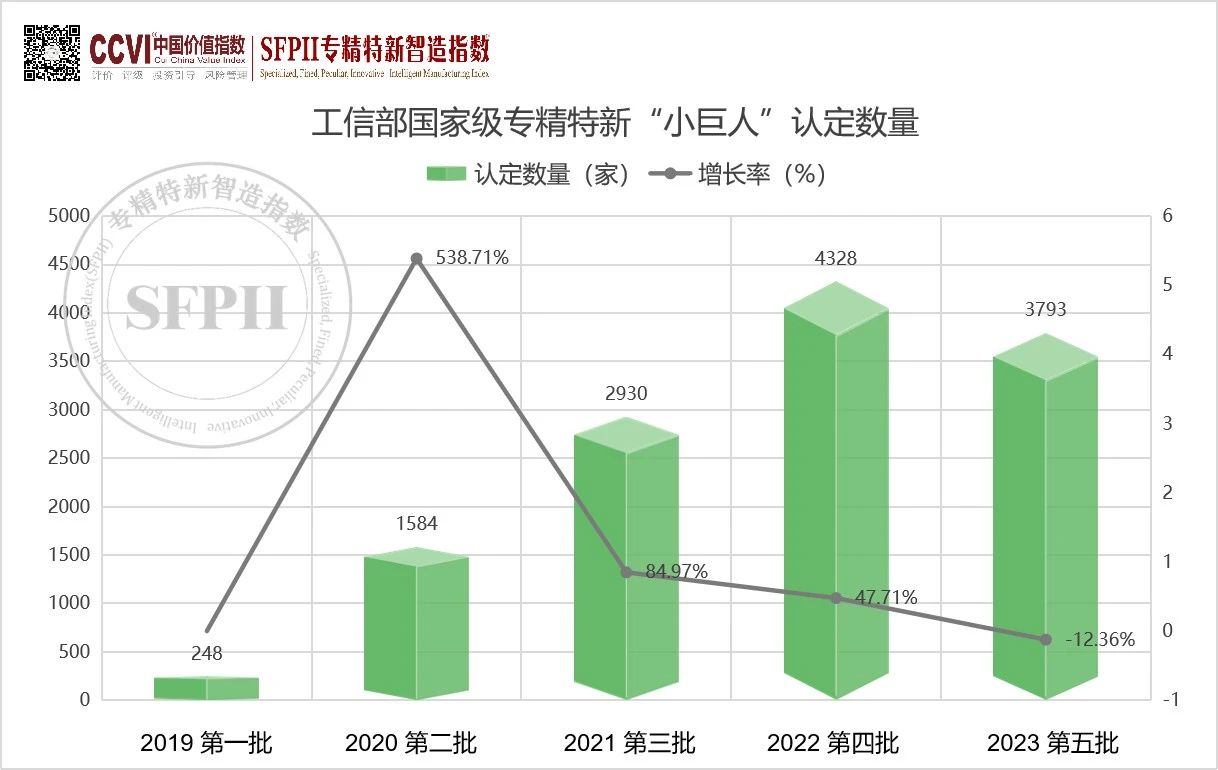 據(jù)SFPII專精特新智造指數(shù)跟蹤顯示,2023年工信部第五批國家級專精特新“小巨人”企業(yè)認(rèn)定共計(jì)3793家,該批申請數(shù)量創(chuàng)歷史新高,合計(jì)約17000家,但是通過率創(chuàng)歷史新低,約22.3%。截至2023年底,全國共有12756家“專精特新”小巨人企業(yè),提前并超額完成了“到2025年,培育1萬家國家級專精特新‘小巨人’企業(yè)”的目標(biāo)”。