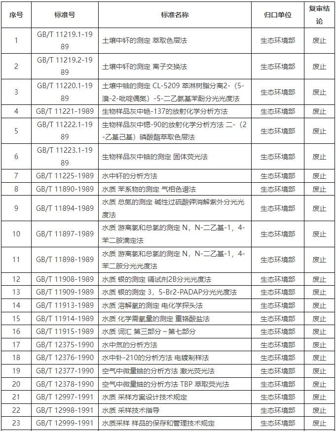 國家標準化管理委員會近日發布通知,對《土壤中钚的測定 萃取色層法》等225項國家標準的復審結論進行公示。根據公示內容,其中由生態環境部歸口管理的84項國家標準被建議廢止,且廢止過渡期為公告即廢止