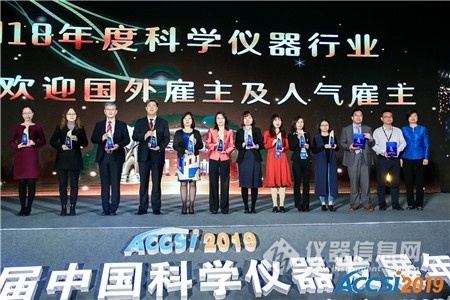 2019年4月18日晚,中國(guó)科學(xué)儀器行業(yè)的“達(dá)沃斯論壇”——2019中國(guó)科學(xué)儀器發(fā)展年會(huì)(ACCSI 2019)于“儀器風(fēng)云榜頒獎(jiǎng)盛典”上,為獲得“2018年度科學(xué)儀器行業(yè)最受歡迎雇主(國(guó)內(nèi)雇主)”、“2018科學(xué)儀器行業(yè)最受歡迎雇主(國(guó)外雇主)”、“2018科學(xué)儀器行業(yè)最佳人氣雇主”的企業(yè)頒獎(jiǎng)。山東大學(xué)教授臧恒昌、環(huán)境保護(hù)部標(biāo)準(zhǔn)樣品研究所應(yīng)用技術(shù)研究室主任劉濤、儀器信息網(wǎng)CEO唐海霞為獲獎(jiǎng)代表頒獎(jiǎng)。