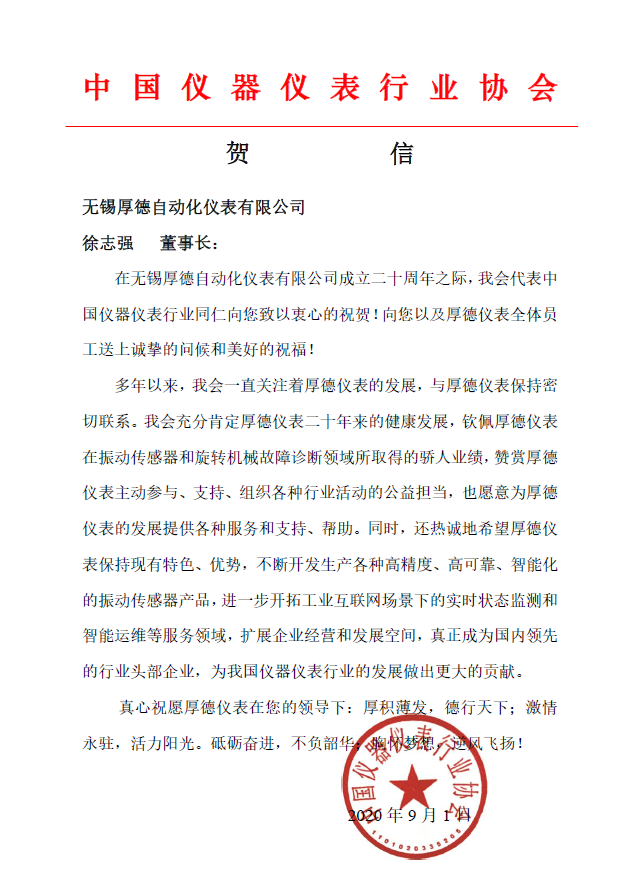值此無錫厚德自動化儀表有限公司成立二十周年之際,我會向其發去賀信,代表中國儀器儀表行業同仁向無錫厚德公司徐志強董事長及厚德儀表全體員工送上誠摯的問候和美好的祝福!