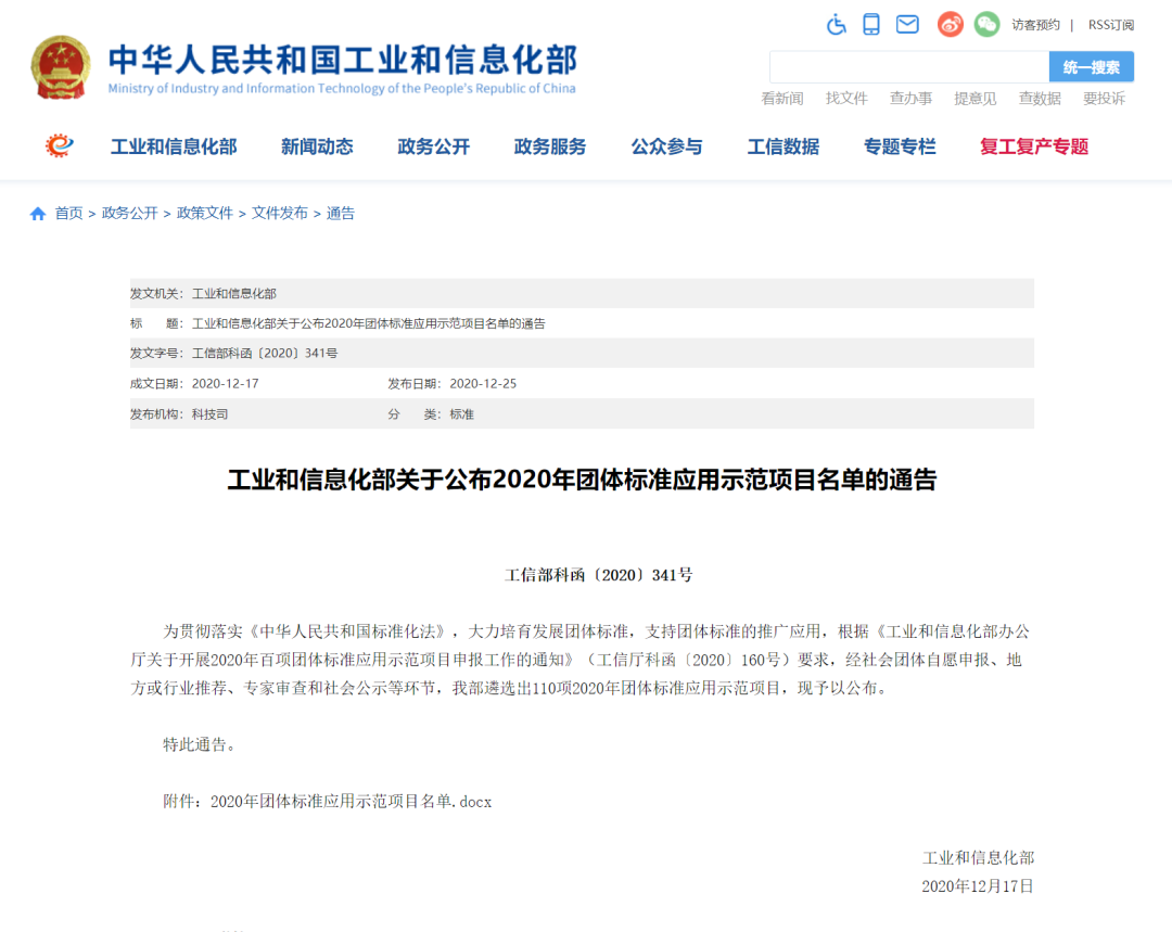 2020年團(tuán)體標(biāo)準(zhǔn)應(yīng)用示范項目是為貫徹落實《中華人民共和國標(biāo)準(zhǔn)化法》,大力培育發(fā)展團(tuán)體標(biāo)準(zhǔn),支持團(tuán)體標(biāo)準(zhǔn)的推廣應(yīng)用,根據(jù)《工業(yè)和信息化部辦公廳關(guān)于開展2020年百項團(tuán)體標(biāo)準(zhǔn)應(yīng)用示范項目申報工作的通知》(工信廳科函〔2020〕160號)要求,經(jīng)社會團(tuán)體自愿申報、地方或行業(yè)推薦、專家審查和社會公示等環(huán)節(jié),由工業(yè)和信息化部遴選后予以公布。
