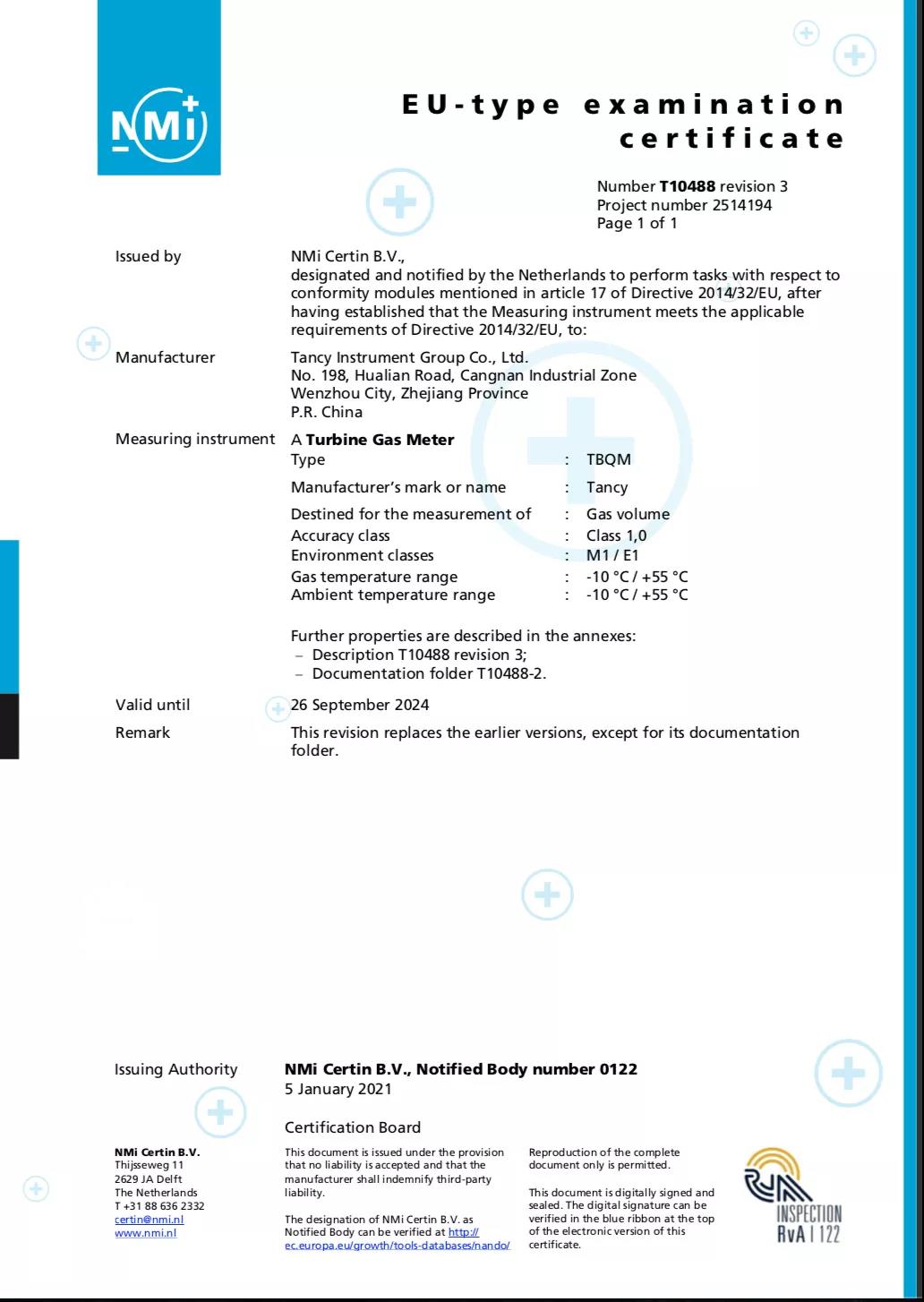 天信TBQM型氣體渦輪流量計通過歐洲荷蘭MID低溫
