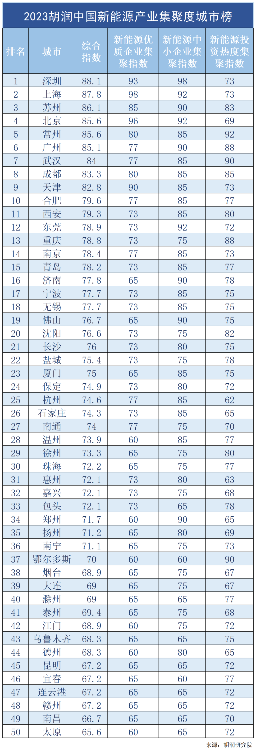 6月19日發布的《2023胡潤中國新能源產業集聚度城市榜》(以下簡稱榜單)顯示,深圳、上海、蘇州位列前三,北京、常州則并列第四,廣州、武漢、成都、天津和合肥分列6-10位。