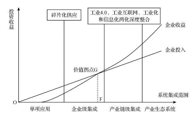 綜上所述,對于制造業數字化改造障礙的認識,國內外學者和企業實踐者基本達成一致:數字化轉型存在兩大基本矛盾,即集成陷阱和中小企業陷阱。“所謂‘集成陷阱’是指企業管理信息的全局優化需求與碎片化供給的矛盾。具體表現為企業在工業化和信息化融合發展的初期階段,各個職能部門各自搞了許多信息系統,卻鮮見信息系統間的連接與集成,最終成為一個個‘信息孤島’”。一般認為,數字化改造只有突破了集成陷阱(突破圖1價值拐點G),企業才會進入工業化和信息化兩化深度融合發展的高級階段,進而進入實質性受益階段。而“所謂‘中小企業陷阱’是指對于廣大中小企業來說,由于缺資金、缺人才,對數字化轉型大都抱有‘不敢轉、不愿轉、不能轉、不會轉、不善轉’的態度;即使有勇于嘗試者,也大都在沒有超越前期沉沒成本(圖1OF段)、尚未突破“集成陷阱”、數字化改造效果尚未顯現前消耗完了所有的資源。”