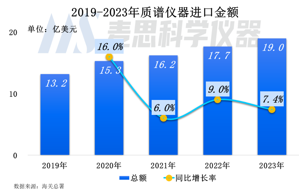 2023年我國(guó)質(zhì)譜儀器(含質(zhì)譜聯(lián)用儀和其他質(zhì)譜儀)進(jìn)口金額達(dá)19.0億美元(約合人民幣133億元),同比上升7.4%。進(jìn)口質(zhì)譜需求依然旺盛。