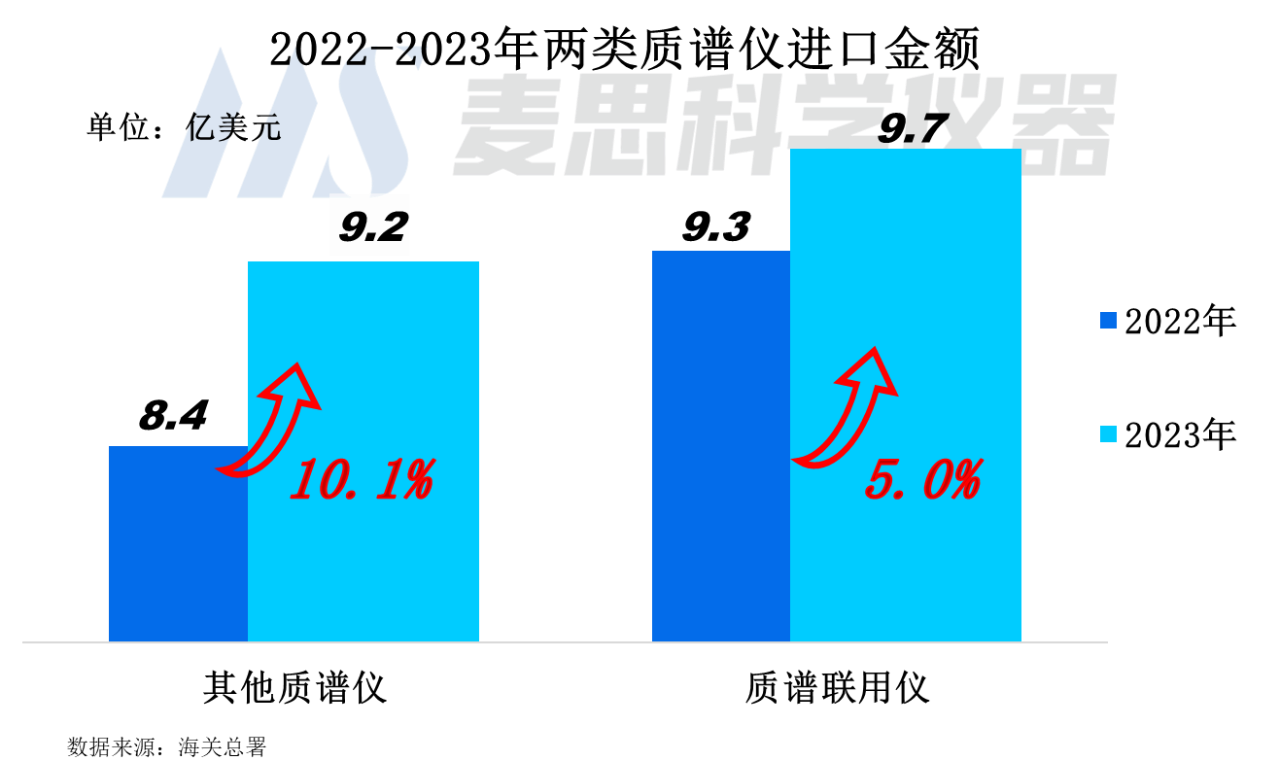 2023年其他質(zhì)譜儀的進(jìn)口金額為9.2億美元,較2022年同比增長(zhǎng)了10.1%。質(zhì)譜聯(lián)用儀進(jìn)口金額達(dá)9.7億美元,較2022年增長(zhǎng)5.0%。兩類(lèi)質(zhì)譜儀進(jìn)口規(guī)模均呈現(xiàn)正增長(zhǎng)。