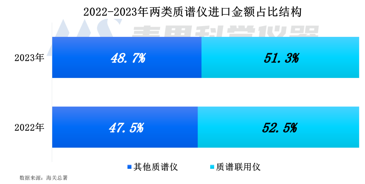 2023年質(zhì)譜聯(lián)用儀的進(jìn)口金額占比達(dá)51.3%,與上年相比減少1.2個(gè)百分點(diǎn);其他質(zhì)譜儀的占比為48.7%。從兩類(lèi)質(zhì)譜儀的金額占比結(jié)構(gòu)看,質(zhì)譜聯(lián)用儀的進(jìn)口需求更旺盛,但兩類(lèi)質(zhì)譜儀的份額差距在縮小。