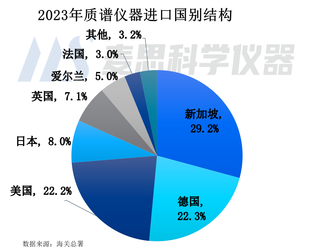 從2023年質(zhì)譜儀器進(jìn)口國(guó)別結(jié)構(gòu)看,排名前五位為新加坡、德國(guó)、美國(guó)、日本以及英國(guó),進(jìn)口金額占比分別為29.2%、22.3%、22.2%、8.0%以及7.1%。