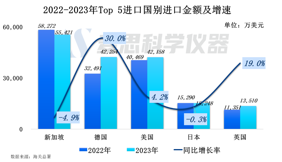 對(duì)比Top5國(guó)別2022年及2023年進(jìn)口金額,從德國(guó)、美國(guó)、英國(guó)進(jìn)口的質(zhì)譜儀器金額呈現(xiàn)正增長(zhǎng),其中德國(guó)最為明顯,同比增速達(dá)30.0%。而新加坡和日本的進(jìn)口金額則有輕微下降趨勢(shì),同比下滑4.9%和0.3%。