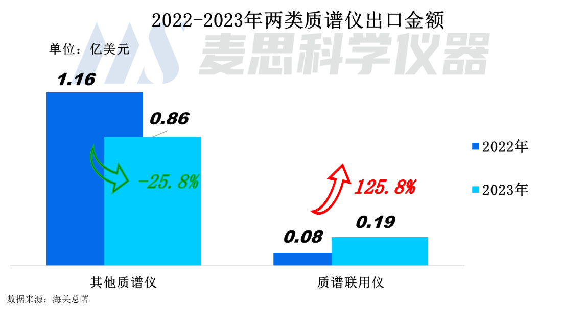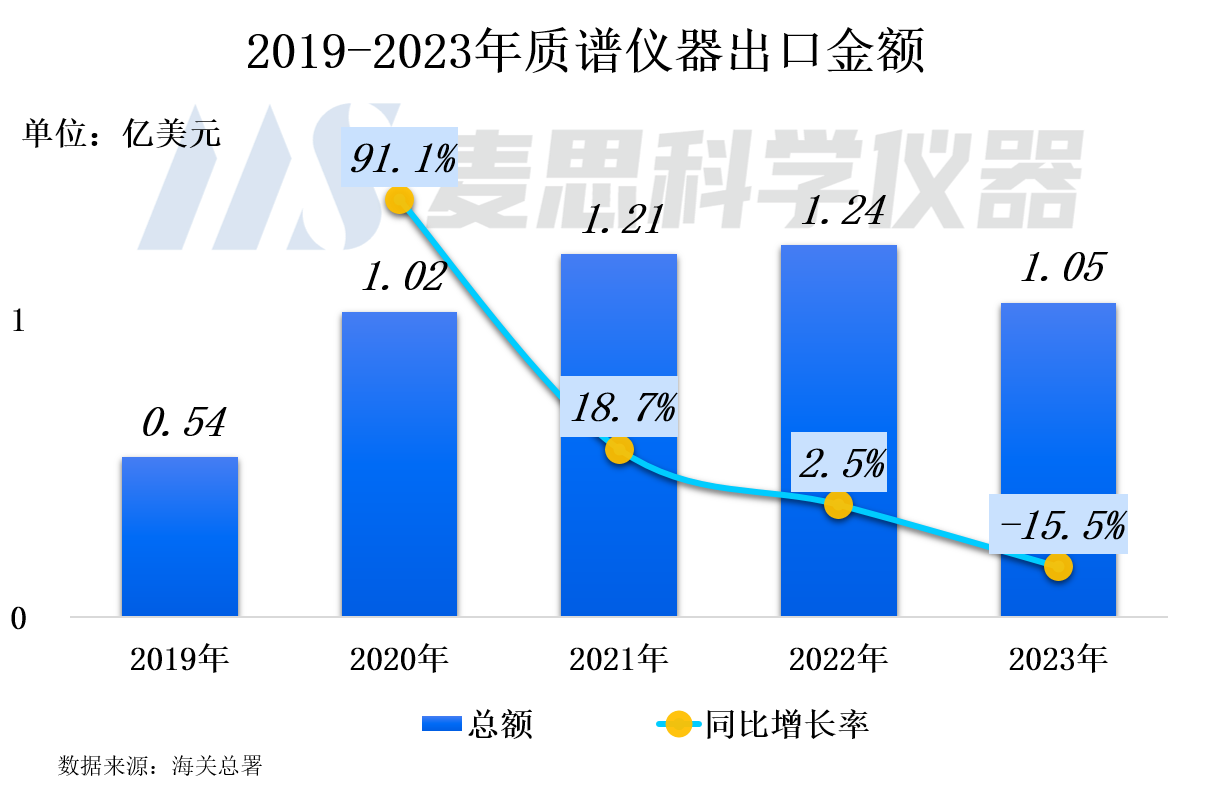 2023年我國(guó)質(zhì)譜儀器出口金額達(dá)1.05億美元(約合人民幣7.35億元),同比下降15.5%。