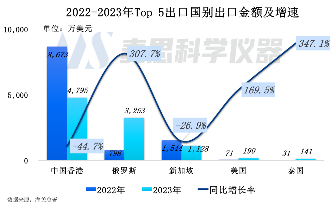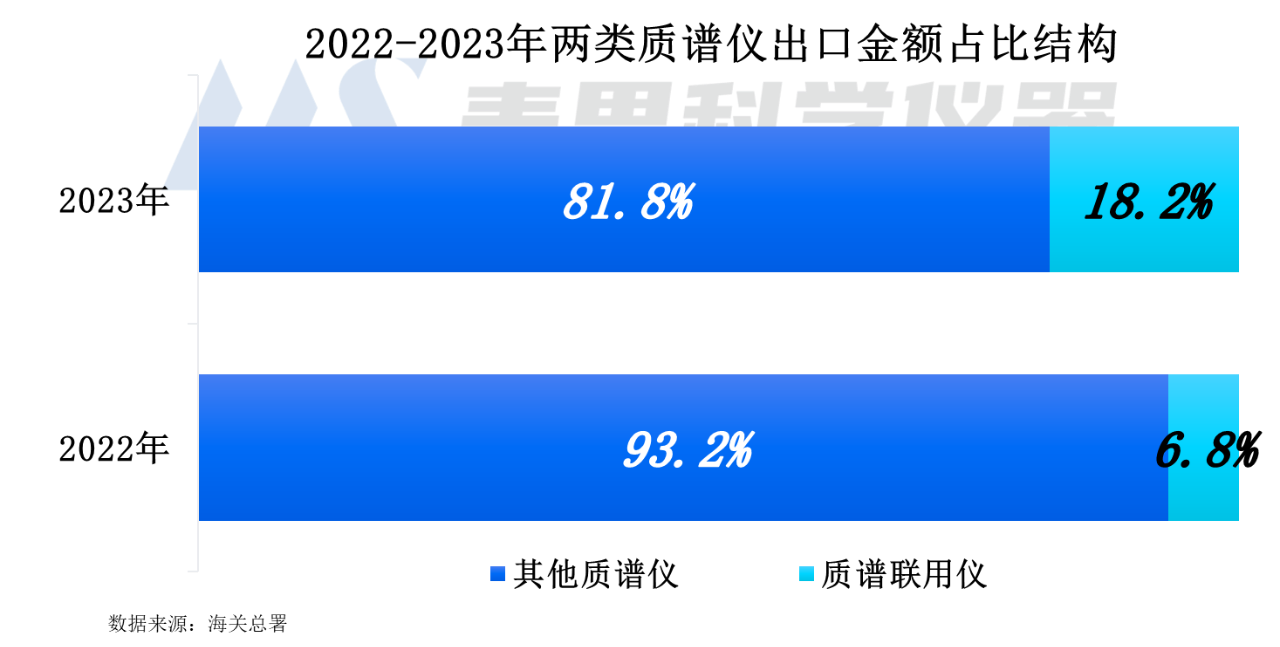 質(zhì)譜聯(lián)用儀的需求大幅增加。2023年質(zhì)譜聯(lián)用儀出口金額為1900萬(wàn)美元,較2022年增長(zhǎng)125.8%。質(zhì)譜聯(lián)用儀的出口金額占比增至18.2%,同比增加11.4個(gè)百分點(diǎn)。