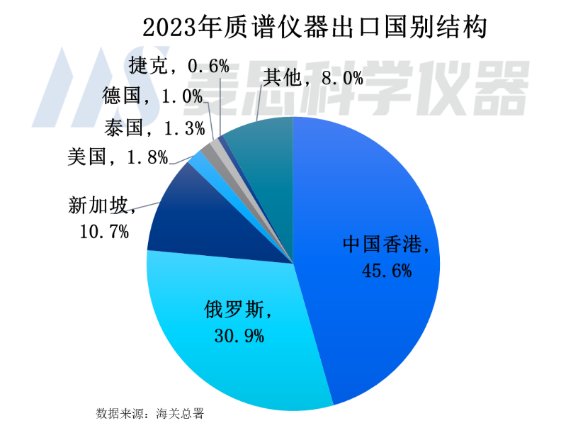 從2023年質(zhì)譜儀器出口國(guó)別結(jié)構(gòu)看,排名前五位為中國(guó)香港(轉(zhuǎn)口貿(mào)易)、俄羅斯、新加坡、美國(guó)以及泰國(guó),出口金額占比分別為45.6%、30.9%、10.7%、1.8%以及1.3%。
