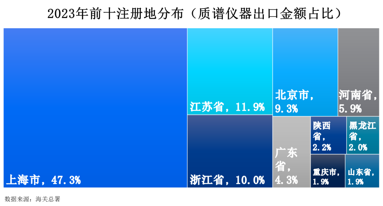 2023年質(zhì)譜儀器出口額前十注冊(cè)地分別為上海市、江蘇省、浙江省、北京市、河南省、廣東省、陜西省、黑龍江省、重慶市和山東省,占比分別為47.3%、11.9%、10.0%、9.3%、5.9%、4.3%、2.2%、2.0%、1.9%和1.9%。