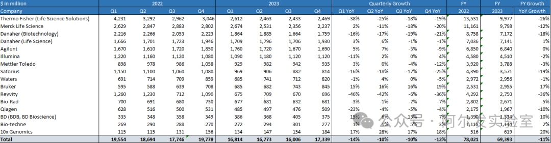 筆者對上市的生命科學(xué)的跨國公司做了一個不完全統(tǒng)計(jì),總共挑選了16家公司,對于某些綜合性的公司,例如賽默飛、丹納赫、默克等,筆者挑出了生命科學(xué)相關(guān)的業(yè)務(wù),盡量去除比如診斷、制藥、化工等業(yè)務(wù)的影響。當(dāng)然,這其中不可避免混雜了其他非生命科學(xué)的業(yè)務(wù),例如凱杰和伯樂的診斷業(yè)務(wù)等,因?yàn)閿?shù)字較小,故沒有進(jìn)行剔除。默克因?yàn)橐?/span>3月初公布業(yè)績,所以這里的四季度的數(shù)據(jù)為筆者的估計(jì)。