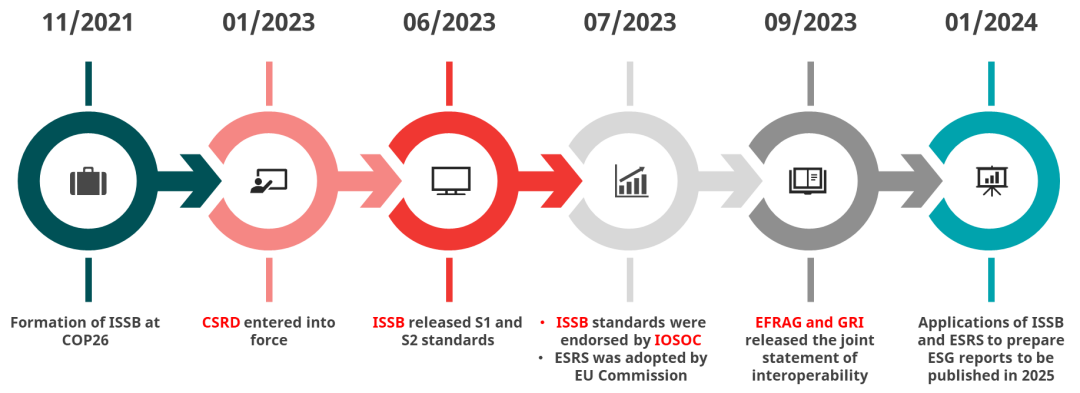 * 2023年6月26日,國際可持續(xù)準(zhǔn)則理事會(ISSB)發(fā)布了首批兩項可持續(xù)報告披露準(zhǔn)則S1(一般要求準(zhǔn)則)和S2(氣候披露準(zhǔn)則)。