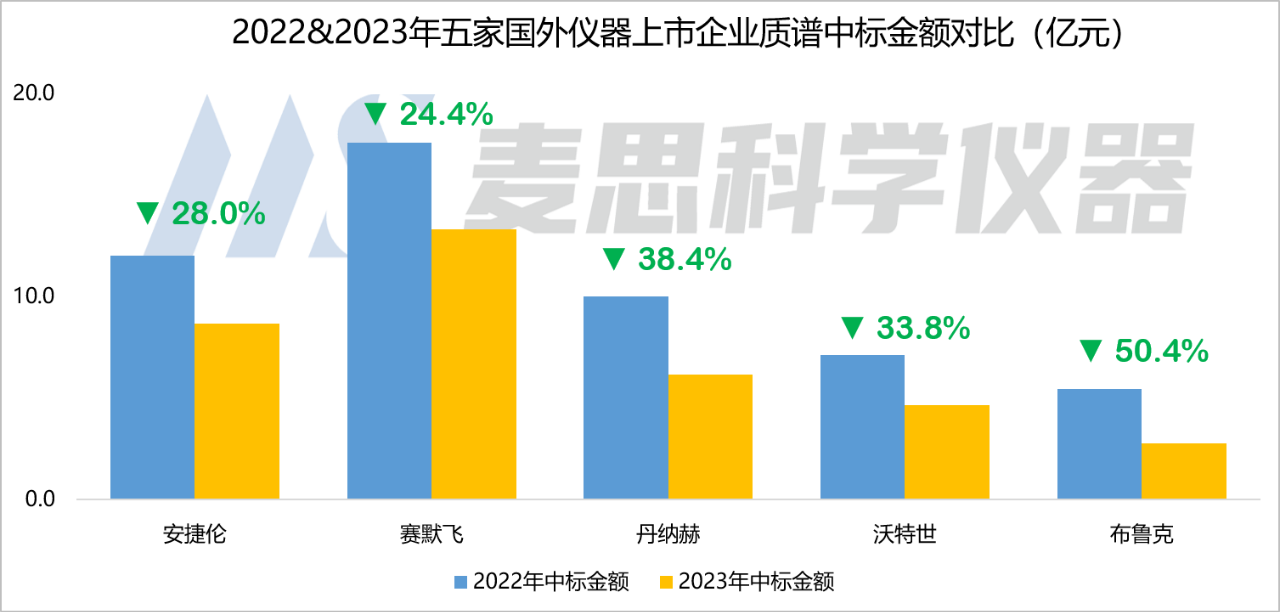 從中標數據來看,雖然2023年上述五家國外企業進入了中國質譜儀器中標市場的TOP 10廠商行列,但他們中標數量和中標金額同比都有比較明顯的下降。
