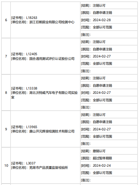 據中國合格評定國家認可委員會(CNAS)消息,2月下半月共計27家機構暫停/撤銷/注銷認可資質。7家機構因超過暫停期限被撤銷認可,其他機構為自愿申請暫停/注銷認可。