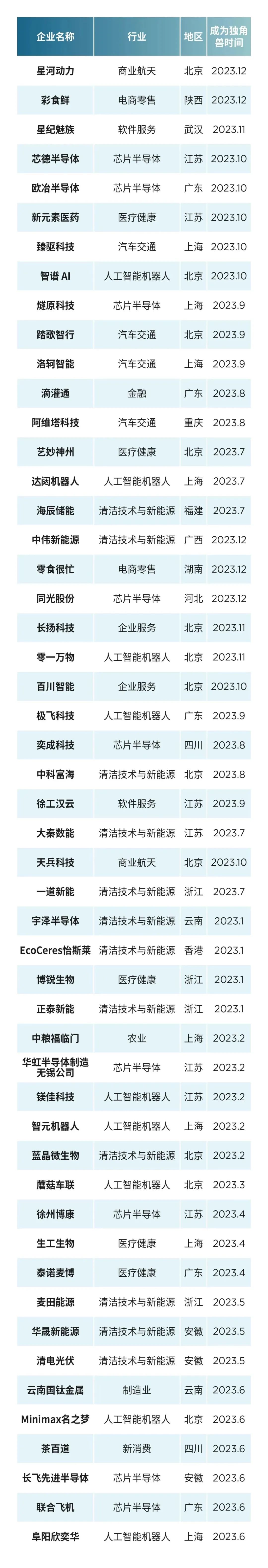 下為2023年中國51家新晉獨角獸企業名單: