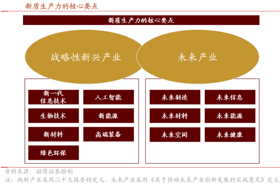 新質(zhì)生產(chǎn)力的核心在于整合科技創(chuàng)新資源,一方面引領(lǐng)發(fā)展戰(zhàn)略性新興產(chǎn)業(yè),國家統(tǒng)計局發(fā)布的《戰(zhàn)略性新興產(chǎn)業(yè)分類(2018)》中有新一代信息技術(shù)產(chǎn)業(yè)、高端裝備制造產(chǎn)業(yè)、新材料產(chǎn)業(yè)、生物產(chǎn)業(yè)、新能源汽車產(chǎn)業(yè)、新能源產(chǎn)業(yè)六大產(chǎn)業(yè)和硬科技的概念不謀而合;另一方面積極培育未來產(chǎn)業(yè),在6G網(wǎng)絡(luò)、可控核聚變、類腦智能、量子信息、基因技術(shù)、深海空天開發(fā)等前沿科技和產(chǎn)業(yè)變革領(lǐng)域贏得發(fā)展主動權(quán),從而以硬科技創(chuàng)新帶動新經(jīng)濟增長點不斷涌現(xiàn)。