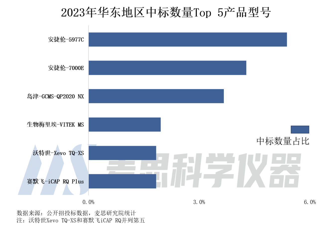 從產品型號來看,2023年華東地區質譜儀器中標數量Top 5產品分別為安捷倫-5977C、安捷倫-7000E、島津-GCMS-QP2020 NX、生物梅里埃-VITEK MS、沃特世-Xevo TQ-XS和賽默飛-iCAP RQ Plus(并列)。