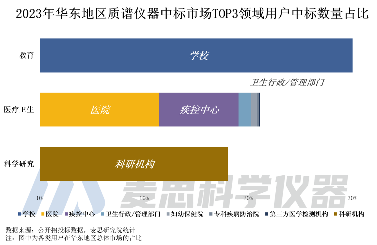 教育領域的用戶為學校,2023年中標數量占全國質譜儀器中標市場約30%,是目前華東地區質譜儀器中標市場最大采購群體。