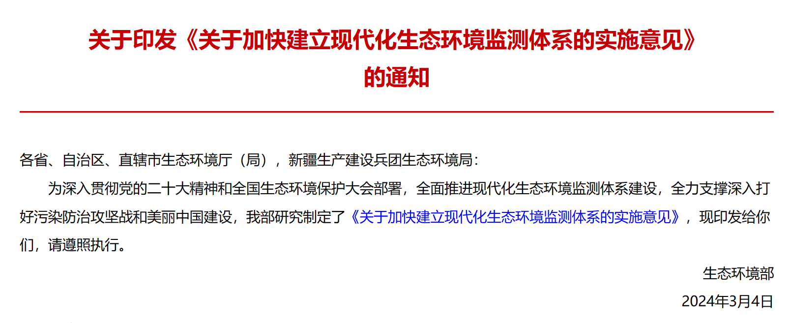 近日,生態(tài)環(huán)境部印發(fā)《關(guān)于加快建立現(xiàn)代化生態(tài)環(huán)境監(jiān)測體系的實施意見》(簡稱《意見》)。這一實施意見旨在深入貫徹黨的二十大精神和全國生態(tài)環(huán)境保護(hù)大會部署,加快建立現(xiàn)代化生態(tài)環(huán)境監(jiān)測體系,全力支撐深入打好污染防治攻堅戰(zhàn)和美麗中國建設(shè),以適應(yīng)生態(tài)文明建設(shè)和生態(tài)環(huán)境保護(hù)的新要求。
