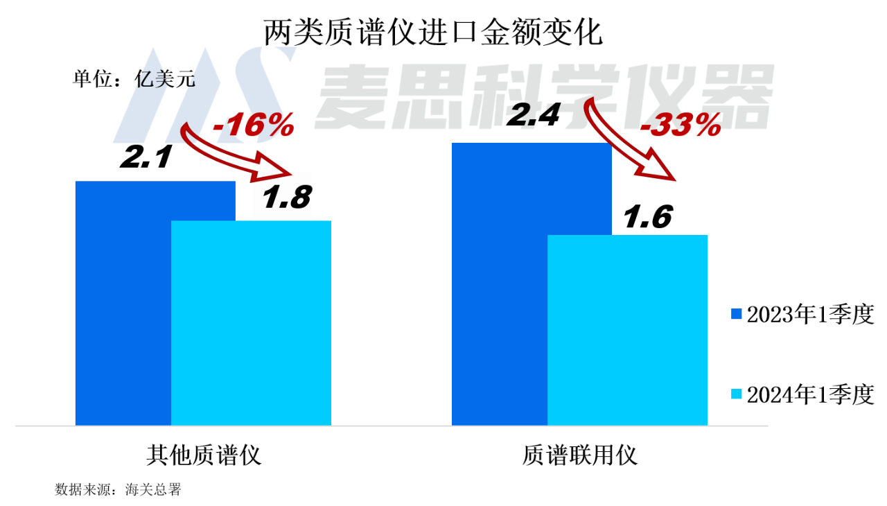 2024年1季度其他質(zhì)譜儀的進(jìn)口金額為2.1億美元,較2023年同期同比下降16%。質(zhì)譜聯(lián)用儀進(jìn)口金額達(dá)1.6億美元,同比下降33%。兩類(lèi)質(zhì)譜儀進(jìn)口規(guī)模均呈現(xiàn)負(fù)增長(zhǎng)。