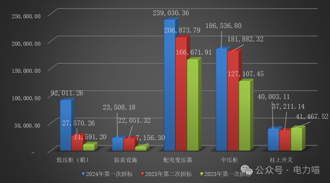 根據物資目錄分類規則,配電設備招標的三級物資名稱包括低壓開關柜、低壓配電箱、干式變壓器、線路避雷器、箱式變壓器、油浸式變壓器、中壓開關自動化成套柜、柱上斷路器共八種。