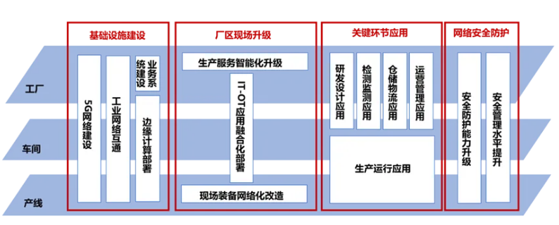 5G工廠建設內容主要包含基礎設施建設、廠區現場升級、關鍵環節應用、網絡安全防護等4個方面。