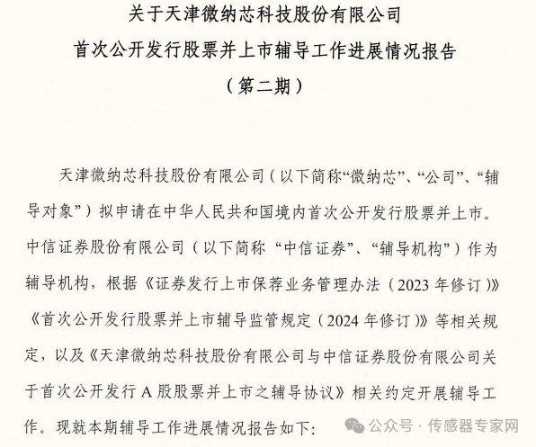 2024年1月19日,中信證券與微納芯簽署了輔導協議并于同日正式向中國證券監督管理委員會天津監管局(簡稱“天津證監局”)報送輔導備案申請材料;2024年1月22日,天津證監局同意微納芯輔導備案并出具輔導備案登記確認書。2024年4月12日,中信證券向天津證監局報送關于天津微納芯科技股份有限公司首次公開發行股票并上市輔導工作進展情況報告(第一期)。2024年7月10日,中信證券向天津證監局報送關于天津微納芯科技股份有限公司首次公開發行股票并上市輔導工作進展情況報告(第二期)。截至目前,中信證券對微納芯的上市輔導工作仍在進行中。