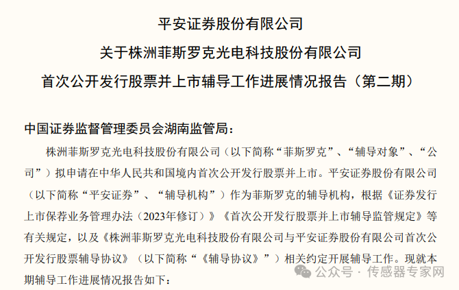 公告顯示平安證券股份有限公司已于2024年1月25日與株洲菲斯羅克光電科技股份有限公司簽訂上市輔導協議,截止2024年7月8日,已完成第二期輔導工作。