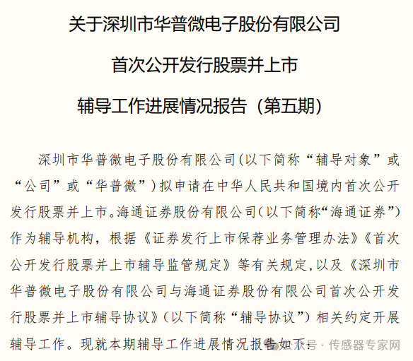 2023年1月16日,華普微與海通證券簽署上市輔導協議,截止2024年4月10日,華普微已完成第五期上市輔導工作。