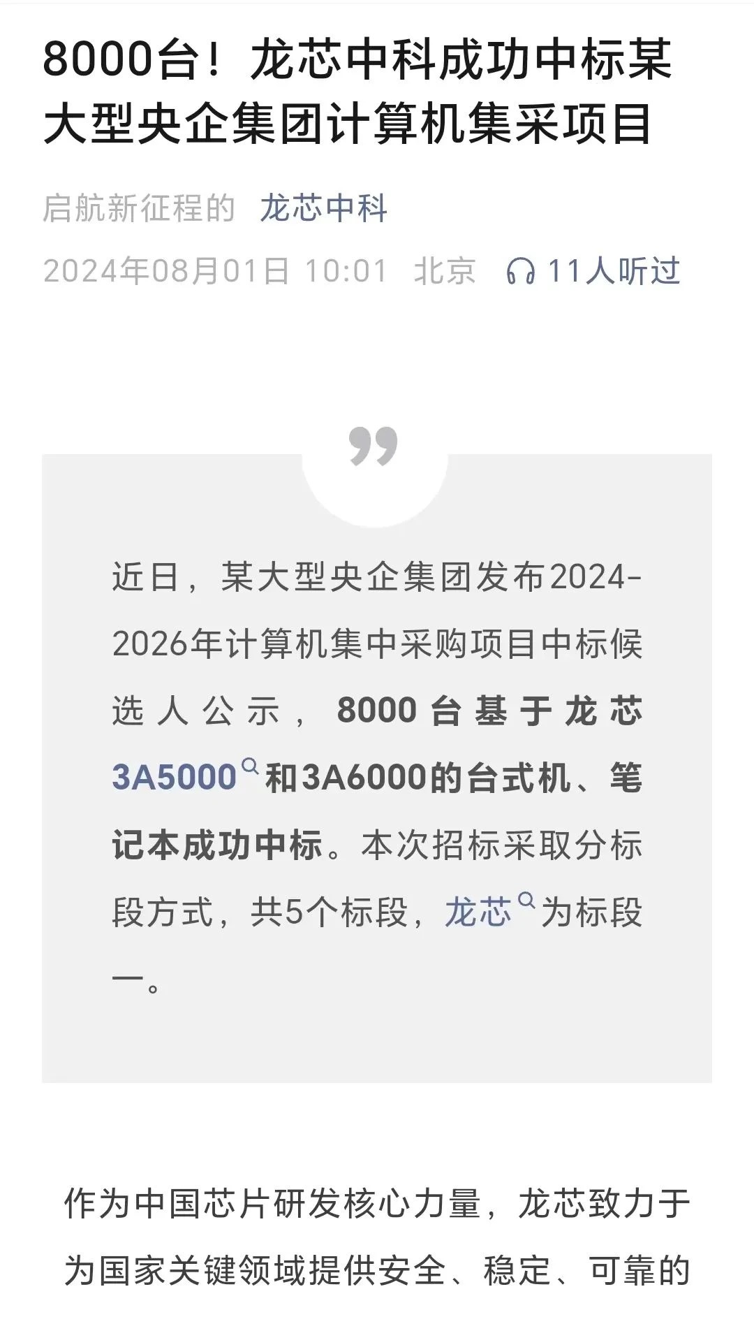 8月1日,龍芯中科在其官方微信公號(hào)中曾發(fā)文稱,近日,某大型央企集團(tuán)發(fā)布2024年-2026年計(jì)算機(jī)集中采購(gòu)項(xiàng)目中標(biāo)候選人公示,8000臺(tái)基于龍芯3A5000和3A6000的臺(tái)式機(jī)、筆記本成功中標(biāo)。本次招標(biāo)采取分標(biāo)段方式,共5個(gè)標(biāo)段,龍芯為標(biāo)段一。