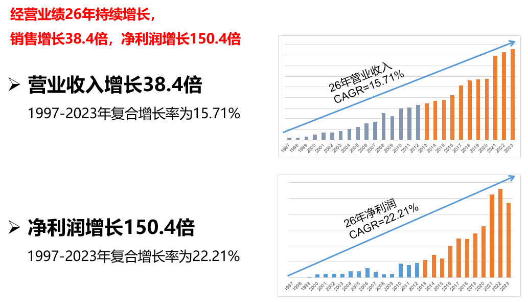 成立26年來(lái),公司銷(xiāo)售增長(zhǎng)38.4倍,凈利潤(rùn)增長(zhǎng)150.4倍,凈利潤(rùn)年復(fù)合增長(zhǎng)達(dá)22.21%。