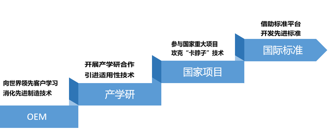 堅(jiān)持高強(qiáng)度研發(fā)投入支持創(chuàng)新,近三年研發(fā)投入營(yíng)收占比均超8%,2023年超10%。公司總結(jié)出階梯式科技資源整合創(chuàng)新路徑,從早期向領(lǐng)先客戶(hù)學(xué)習(xí)基本的生產(chǎn)工藝與產(chǎn)品設(shè)計(jì)知識(shí),到與高校院所進(jìn)行產(chǎn)學(xué)研合作學(xué)習(xí)新產(chǎn)品開(kāi)發(fā),再到參與國(guó)家重大工程進(jìn)行研發(fā)學(xué)習(xí)來(lái)探索前沿技術(shù)。現(xiàn)階段是借助標(biāo)準(zhǔn)平臺(tái)開(kāi)發(fā)先進(jìn)標(biāo)準(zhǔn),在標(biāo)準(zhǔn)制定中學(xué)。