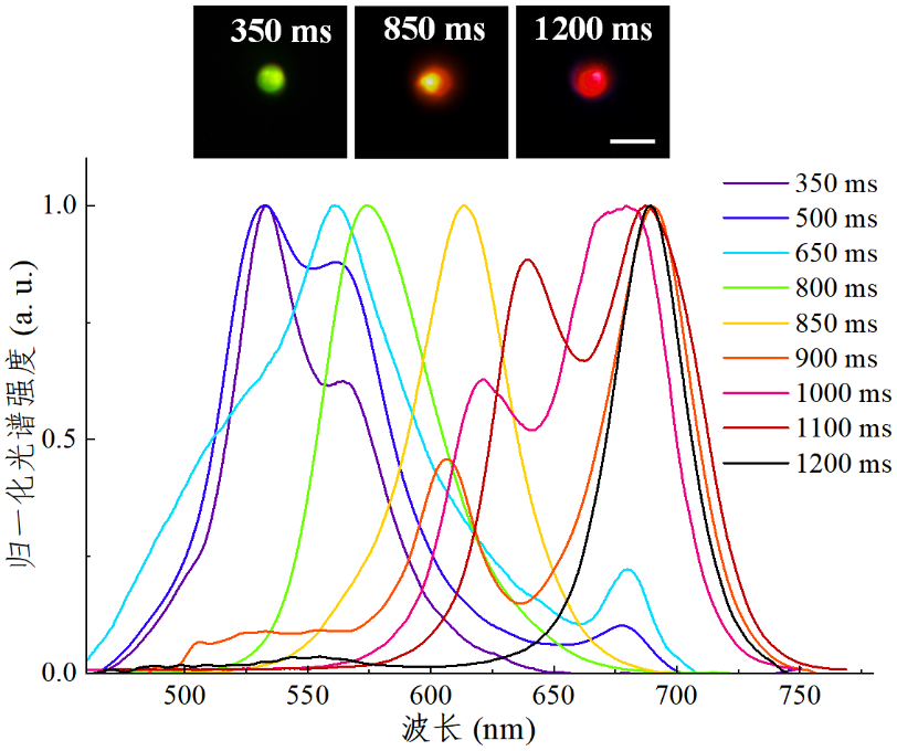 圖3(d)中綠色發(fā)光CsPbBr3納米晶和黃色CsPb(Br1−xIx)3納米晶線條組成的“鳥”圖案。在Br-Cl共摻的玻璃中,利用激光直寫出了綠色CsPbBr3納米晶和藍色 CsPb(Br1−xClx)3納米晶軌跡線組成的“鳥”圖案。在Cl-Br-I三種鹵素共摻的玻璃中展示了全彩色的“蝴蝶”圖案直寫(圖3)。除二維圖案外,利用納米位移平臺在玻璃內(nèi)部的精度定位和移動,還實現(xiàn)了三維空間內(nèi)微米“螺旋線”的直寫,展示該技術(shù)方案鈣鈦礦材料在三維圖案化方面的巨大潛力。