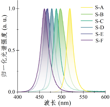 除A位鹵素陰離子帶隙可控的納米晶直寫外,研究人員在B位Cd/Pb陽離子體系證明了該方法可以調(diào)控玻璃中局部的納米液相分離和離子交換過程,并有效的控制元素的重新分布并調(diào)控局部化學成分。通過優(yōu)化脈沖持續(xù)時間、重復頻率和脈沖能量以及玻璃組分中Cd/Pb的比例,在含銫、鉛、鎘和鹵化物元素的硼硅酸鹽玻璃中實現(xiàn)了超快激光誘導CsPbxCd1-xBr3納米晶析出,其發(fā)光波長可調(diào)范圍為461 nm~514 nm(圖2)。
