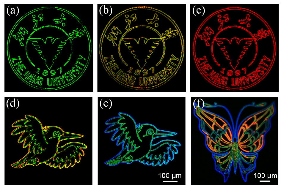 圖3(a)~(c)在玻璃內(nèi)部直寫不同顏色的浙江大學校徽,(d)~(f)納米晶彩色圖案直寫