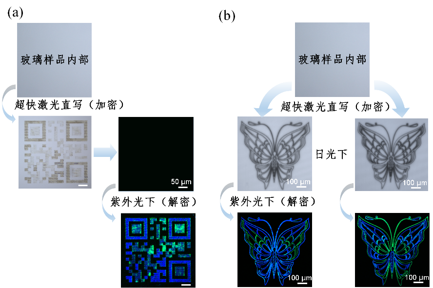 利用超快激光直寫的方法可以在在同一片玻璃內(nèi)部三維直寫發(fā)光波長組合可調(diào)的納米晶圖案,該技術(shù)可以用于創(chuàng)建快速響應(yīng)的二維碼,直寫帶有加密信息的數(shù)據(jù)圖案,如圖6(a)所示。基于納米晶發(fā)光波長的可調(diào)節(jié)性,在圖案的不同區(qū)域可以指定其發(fā)光色彩(例如藍色和綠色),且這種顏色分布差異在日光下并不可見,只能在紫外光照射下觀察到。如圖6(b)所示,在日光下直寫的“蝴蝶”圖案沒有顯著差異,但在紫外光下圖案在不同區(qū)域呈現(xiàn)不同顏色。與其它基于鈣鈦礦納米晶的加密標簽相比,玻璃中直寫的納米晶具有顯著的光穩(wěn)定性和熱穩(wěn)定性,更加適用于關(guān)鍵信息的加密和解密。