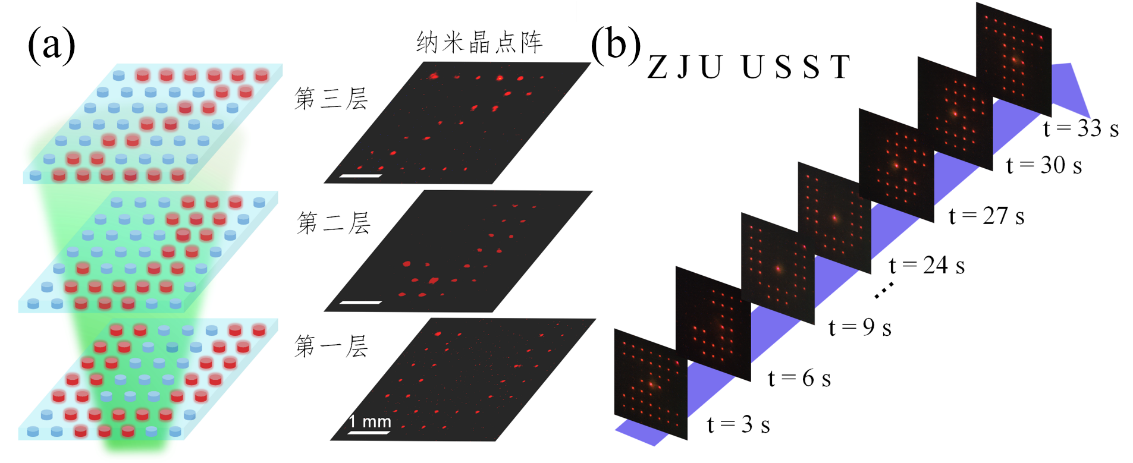 除二維的平面顯示外,該技術(shù)方案還能演示三維的全息顯示器件。將立體的圖案通過空間光調(diào)制器設(shè)計的全息圖在多個平面上分層顯示,可以同時激發(fā)點亮不同層的圖案。如圖 5(a)所示,三幅全息圖像(字母Z、J和U)激發(fā)的熒光圖案在沿激發(fā)光輻照方向上的多個平面上同時被構(gòu)建,在不同層顯示了對應(yīng)的字母Z、J和U的紅色熒光圖案。預先設(shè)置好的全息圖案的播放時間和順序,在內(nèi)部具有多個納米晶發(fā)光單元陣列的玻璃基板上還能實現(xiàn)動態(tài)的全息顯示,如圖5(b)在不同時刻分別顯示了字母Z、J、U、U、S、S、T的熒光圖案。