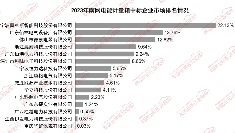 2023年度,南網(wǎng)范圍內(nèi)電能計量箱產(chǎn)品的招標市場總體規(guī)模約為5.4億元,共有15家企業(yè)中標。在這些企業(yè)中,寧波奧克斯智能科技股份有限公司中標金額最大,約為1.2億元元,占比約22.1%。其次,是廣東佰林電氣設備廠有限公司和佛山市豪象電器有限公司,中標金額分別為74.6百萬元和68.4百萬元,占比分別為13.8%和12.6%。整體來看,南網(wǎng)電能計量箱產(chǎn)品市場的供應商整體較為集中。