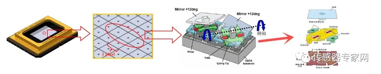 DLP芯片即在一塊硅基中,使用MEMS技術,批量制造成千上萬個“鏡子”——微鏡,下圖是DMA芯片的封裝結構示意圖,可以點擊放大查看。