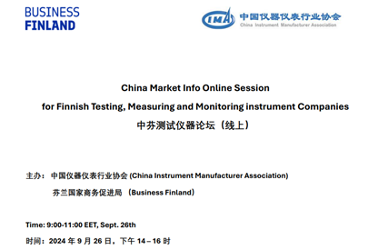 2024年9月26日,由中國儀器儀表行業(yè)協(xié)會(CIMA)和芬蘭國家商務(wù)促進(jìn)局(Business Finland)聯(lián)合主辦的中芬測試儀器論壇(線上)成功舉行。本次論壇旨在促進(jìn)中、芬兩國在測試、測量和監(jiān)測儀器領(lǐng)域的交流與合作,吸引了中、芬多家企業(yè)代表的參與。