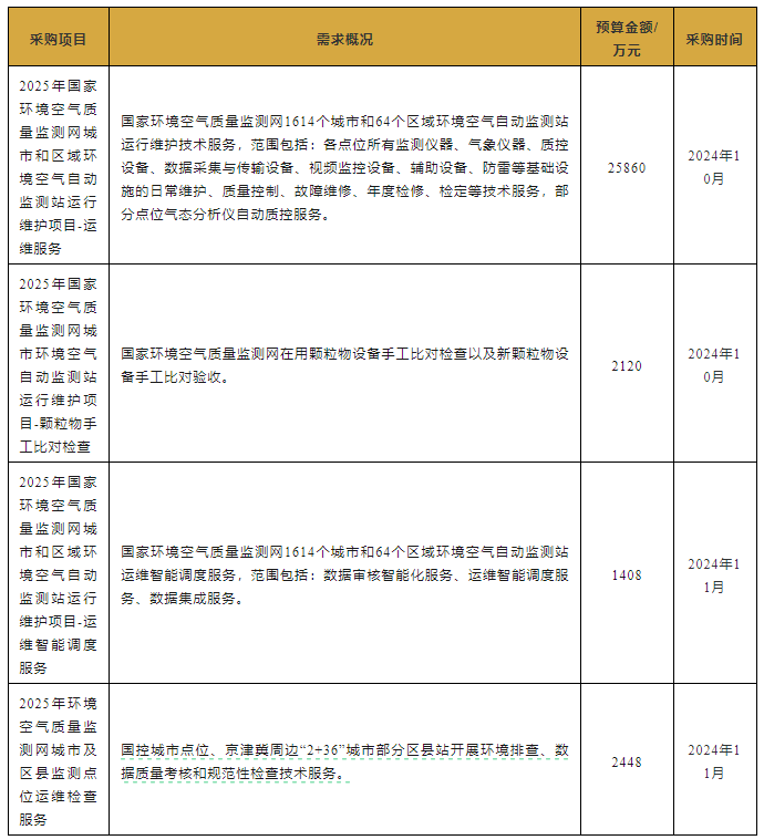 近日,中國環境監測總站發布4項儀器設備采購意向,預算總額達3.18億元,涉及2025年國家環境空氣質量監測網城市和區域環境空氣自動監測站運行維護項目、2025年國家環境空氣質量監測網城市環境空氣自動監測站運行維護項目-顆粒物手工比對檢查、2025年國家環境空氣質量監測網城市和區域環境空氣自動監測站運行維護項目-運維智能調度服務、2025年環境空氣質量監測網城市及區縣監測點位運維檢查服務等,預計采購時間為2024年10~11月。