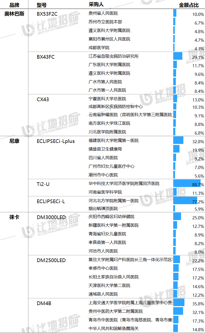 主要采購(gòu)單位及對(duì)應(yīng)中標(biāo)品牌包括:貴州省人民醫(yī)院(奧林巴斯),慶陽(yáng)市西峰區(qū)婦幼保健院(徠卡),福建醫(yī)科大學(xué)附屬第一醫(yī)院(尼康)等。