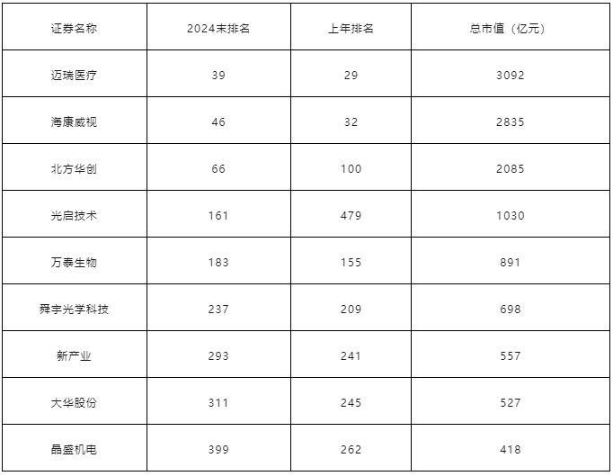 2024年股市圓滿收官,中國(guó)上市公司市值500強(qiáng)榜單隨之揭曉。數(shù)據(jù)顯示,2024年市值500強(qiáng)企業(yè)平均市值、中位數(shù)市值和最低市值分別為1483億元、651億元和344億元,較2023年分別增長(zhǎng)241億元、60億元和36億元。 經(jīng)小編統(tǒng)計(jì),多家儀器企業(yè)登榜,涵蓋邁瑞醫(yī)療(生命科學(xué)儀器領(lǐng)域)、海康威視(光學(xué)儀器領(lǐng)域)及北方華創(chuàng)(半導(dǎo)體設(shè)備供應(yīng)商)等,展現(xiàn)了其在各自專業(yè)領(lǐng)域的卓越成就。